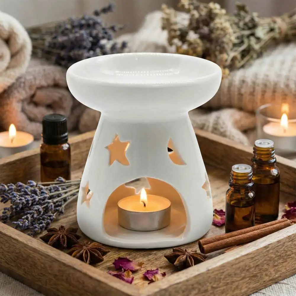 Brûleur Huile Céramique Blanc Lune Étoiles | Diffuseur Aromathérapie 5x7cm