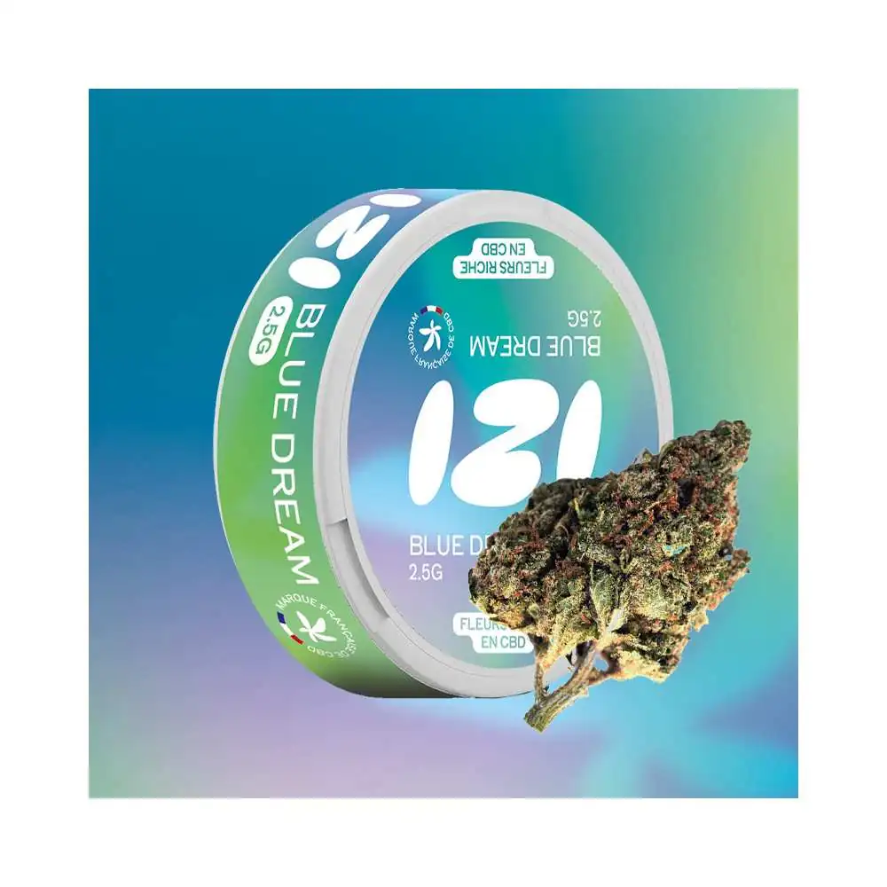 Découvrez la fleur de CBD Blue Dream 2.5g aux arômes fruités de myrtille et notes sucrées. Cette variété premium cultivée en greenhouse en France offre des têtes compactes résineuses avec une génétique hybride Amnesia x Blueberry Haze.