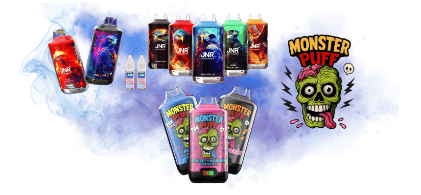 Nous proposons les plus grandes marques du marché : ElfBar (Elfa Pro, 4-in-1, NIO 30K), JNR (Falcon-X Plus 28K, AeroX 32K, Joker 24K, Panda 25500), Vaporesso (Dojo Blast Bundle 30K), Monster Puff (28K, conçue en France) et bien d'autres. Consultez nos catégories Puff 30K et Puff 28K pour comparer les modèles.