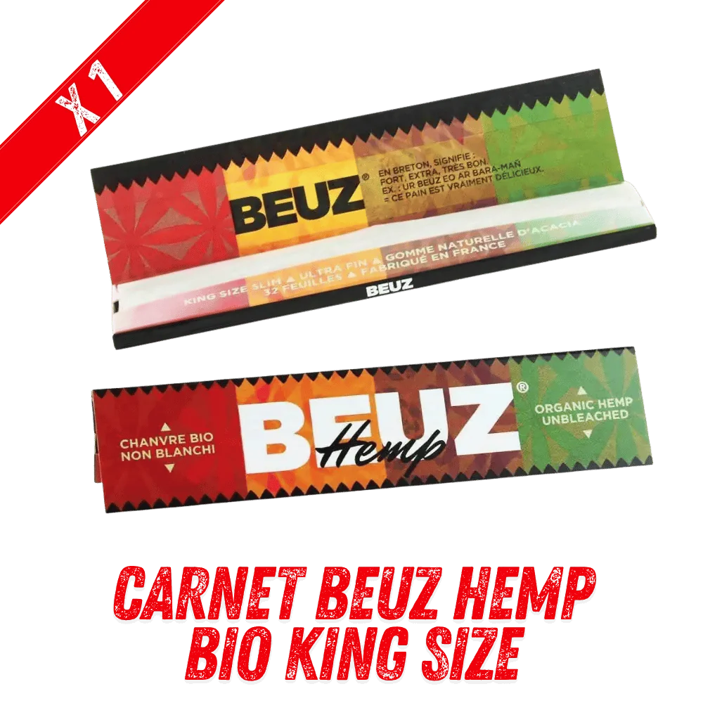 Le carnet Beuz Hemp Bio King Size contient 32 feuilles au format slim (110x44mm), fabriquées en France à partir de chanvre 100% biologique non blanchi. Épaisseur de 13,5g/m2 pour une combustion lente et régulière, sans additifs chimiques. L'unité idéale pour tester ou compléter votre stock.