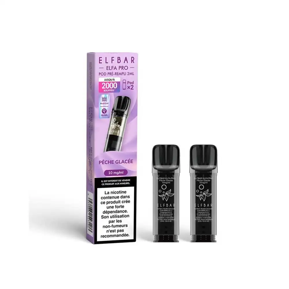 Pack de 2 pods pré-remplis Pêche Glacée pour Elfa Pro ElfBar. Chaque pod contient 2ml de e-liquide en sels de nicotine avec technologie QUAQ Mesh pour un rendu des arômes constant. Saveur pêche juteuse relevée d'une note glacée. Environ 600 bouffées par pod. Compatible exclusivement avec la batterie Elfa Pro.