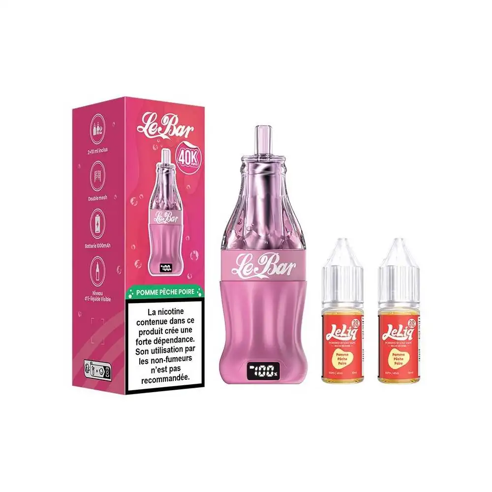 La Puff Le Bar 40K se distingue par son système de remplissage intelligent incluant 2 flacons de 10ml permettant une utilisation prolongée sans compromis sur la qualité. Son design iconique inspiré des bouteilles vintage allie esthétique et ergonomie pour une prise en main optimale. Le tirage automatique sans bouton simplifie l'utilisation tandis que l'écran digital informe en temps réel sur le niveau de batterie restant. Cette innovation de Lost Vape garantit une restitution de saveurs constante grâce à sa technologie Dual Mesh qui optimise la vaporisation de l'e-liquide. Le mélange fruité équilibré de pomme verte, pêche et poire offre une expérience gustative rafraîchissante à chaque inspiration.