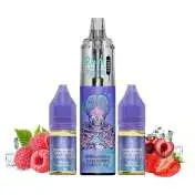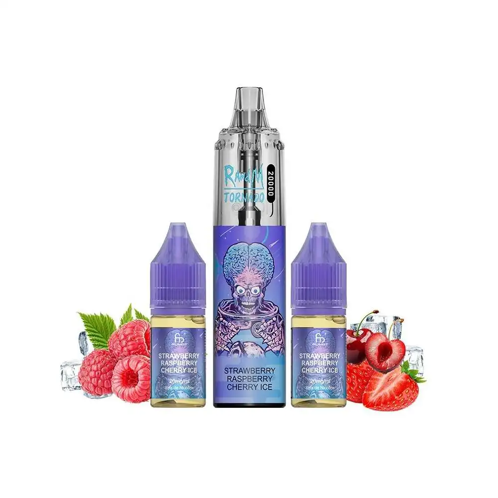Le kit comprend 1 dispositif Puff Tornado RandM 850mAh avec réservoir vide et 2 flacons de 10ml de e-liquide saveur Strawberry Raspberry Cherry Ice aux sels de nicotine 20mg.